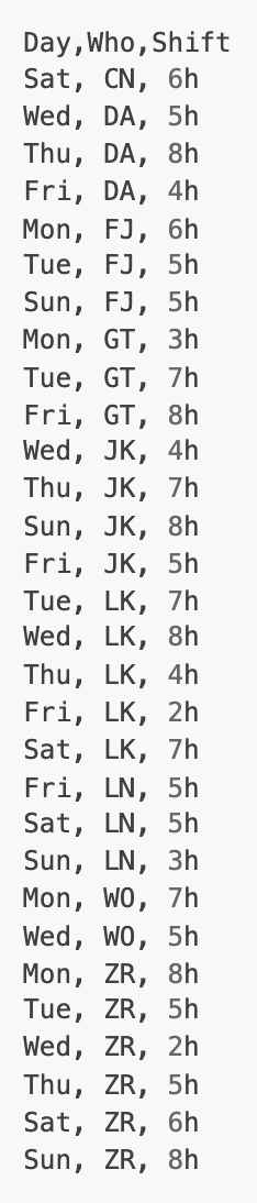 To further motivate the use of TabularDelta, let's take a concrete example. Suppose you are an investor in a factory and have just received the new weekly work schedule. Not only is the new schedule sorted by initials (instead of weekdays), but it is also shorter. Now you want to find out as quickly as possible: Is this due to less demand? Will the factory be closed on specific days? Or is the reduced number of shifts just compensated by longer working hours?